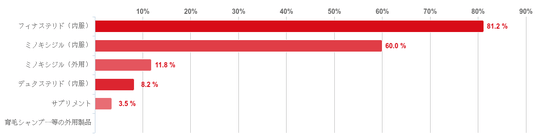「フィナステリド(内服薬)」と回答した人が81.2%で最も多く、次いで「ミノキシジル(内服)」との回答が60.0%と続き、この二つの回答が多くの割合を占めた。そのほか、「ミノキシジル(外用)」が11.8%、「デュタステリド(内服)」が8.2%と少数の回答を得た。