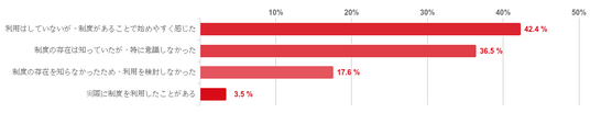 「利用はしていないが、制度があることで始めやすく感じた」と回答した人が42.4%で最も多く、次に「制度の存在は知っていたが、特に意識しなかった」との回答が36.5%となり、制度の存在を知っていた人が約8割だったが、「実際に制度を利用したことがある」との回答は3.5%と僅かで、「全額返金保証制度」の利用経験がある人はほとんどいないことがわかった。反対に、「制度の存在を知らなかったため、利用を検討しなかった」と回答した人は17.6%だった。