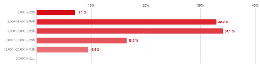 「5,000~8,000円未満」と回答した人が34.1%で最も多く、次いで「2,000~5,000円未満」との回答が32.9%で続き、回答者の約7割の人の1ヶ月あたりの負担額が「2,000~8,000円未満」だということがわかった。そのほか、「8,000~12,000円未満」と回答した人が16.5%、「2,000円未満」との回答が%と7.1で、20,000円以上と回答した人はいなかった。