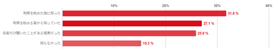 「利用を始めた後に知った」との回答が31.8%で最も多く、次に「利用を始める前から知っていた」との回答が27.1%、「名前だけ聞いたことがある程度だった」が25.9%で続いた。また、「知らなかった」と回答した人は15.3%と少数だった。
