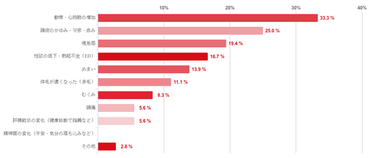 「動悸・心拍数の増加」との回答が共に33.3%で最も多く、次いで「頭皮のかゆみ・発疹・赤み」との回答が25.0%、「倦怠感」との回答が(19.4%)となった。そのほか、「性欲の低下・勃起不全(ED」、「めまい」、「体毛が濃くなった(多毛)」などの回答も少数みられた。