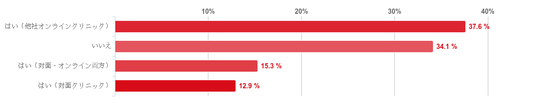「はい(他社オンラインクリニック)」(37.6%)が最も多く、次に「いいえ」と回答した人が34.1%となった。続いて、「はい(対面・オンライン両方)」(15.3%)「はい(対面クリニック)」(12.9%)という順となった。