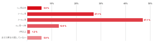 「3~6ヶ月」と回答した人が47.1%で最も多く、次に「1~3ヶ月」との回答が27.1%で続き、回答者の7割以上が「1~6ヶ月」で治療の効果を実感し始めていることがわかった。また、「1年以上」と回答した人は1.2%と僅かだった。