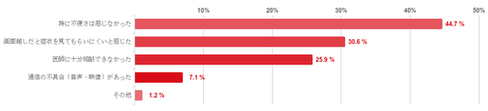 「特に不便さは感じなかった」と回答した人が44.7%で最も多かったが、そのほか、「画面越しだと症状を見てもらいにくいと感じた」との回答が30.6%、「医師に十分相談できなかった」が25.9%と一定数みられた。