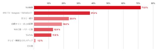 「Web検索(GoogleやYahoo!など)」と回答した人が71.8%で圧倒的に多く、次いで「SNS(X、Instagram、TikTokなど)」(37.6%)、「口コミ・知人の紹介」(23.5%)という順となった。