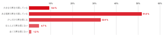 「ある程度効果を実感している」と回答した人が51.8%で最も多く、次に「少しだけ効果を感じる」との回答が32.9%、「大きな効果を実感している」が9.4%で続き、回答者の9割以上が治療の効果を実感していることがわかった。反対に、「ほとんど効果を感じない」との回答が9.2%、「全く効果を感じない」との回答は1.2%と僅かだった。