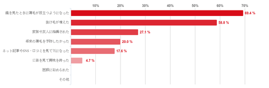 「鏡を見たときに薄毛が目立つようになった」と回答した人が69.4%、「抜け毛が増えた」との回答が58.8%と、この2つが5割を超えて圧倒的に多かった。また、「家族や友人に指摘された」との回答が27.1%、「将来の薄毛を予防したかった」との回答が20.0%と一定数みられた。