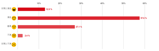 「満足」と回答した人が57.6%となり、約7割で最も多く、「非常に満足」(12.9%)との回答と合わせると約8割の人が満足していることがわかった。反対に、「不満」と回答した人は2.4%と僅かで「非常に不満」と回答した人はいなかった。