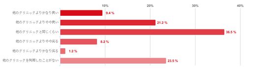 「他のクリニックと同じくらい」と回答した人が36.5%で最も多かったが、「他のクリニックよりやや良い」と回答した人が21.2%、「他のクリニックよりかなり良い」が9.4%となり、他のクリニックよりも良いと感じている人が約3割だということがわかった。そのほか、「他のクリニックを利用したことがない」と回答した人が23.5%で、「他のクリニックよりやや劣る」や「他のクリニックよりかなり劣る」と回答した人は僅かだった。