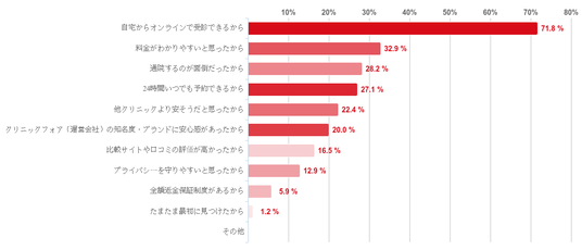 「自宅からオンラインで受診できるから」と回答した人が71.8%で圧倒的に多かった。続いて、「料金がわかりやすいと思ったから」(32.9%)、「通院するのが面倒だったから」(28.2%)、「24時間予約できるから」(27.1%)という順で並んだ。