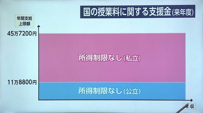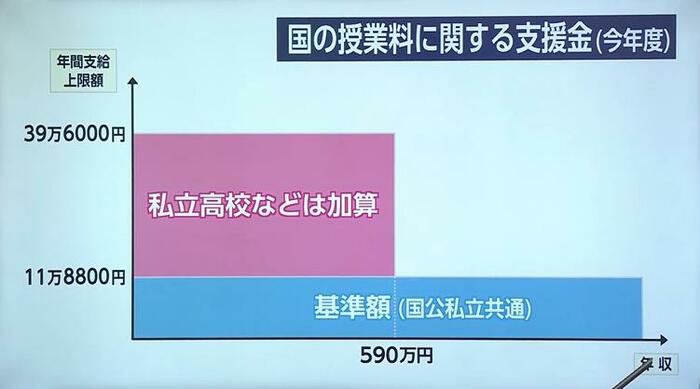 2025年度、国の授業料に関する支援金の所得制限がなくなり、公立・私立を問わず、年間ひとりあたり11万8800円が支給されていた。私立高校の場合、これに加え年収590万円未満の家庭には最大で27万7200円が支給されていた。