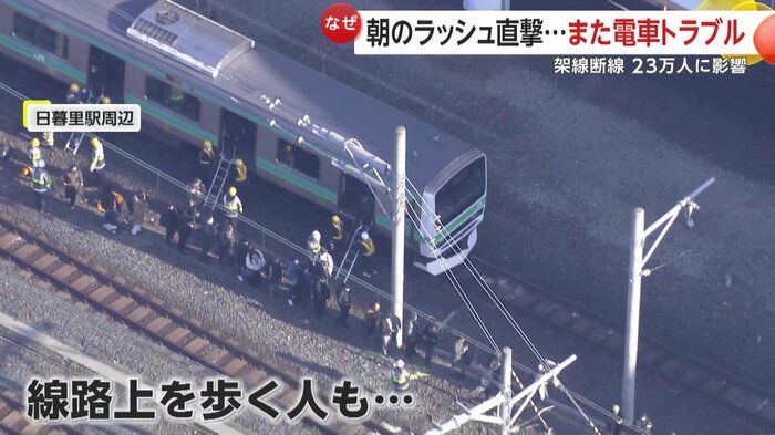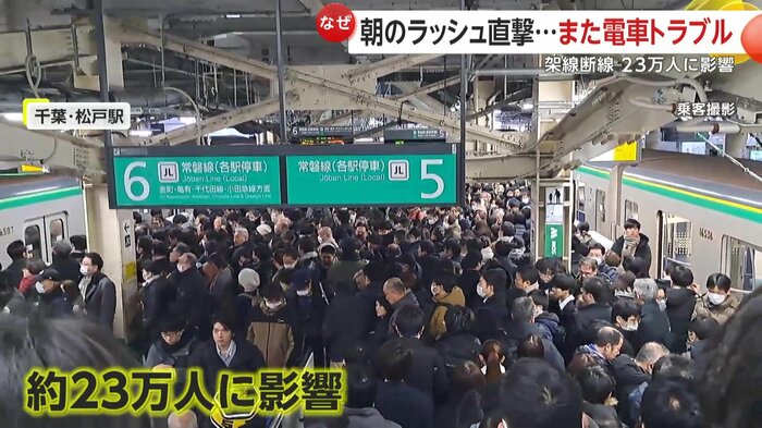 30日朝、JR常磐線など3路線が架線トラブルで運転を見合わせ、松戸駅などでホームが乗客であふれた。日暮里付近では乗客が線路上を歩いて避難し、約23万人に影響し、6人が負傷・体調不良を訴えた。全線は午後2時前に運転を再開した。なぜトラブルは相次いでいるのか―。