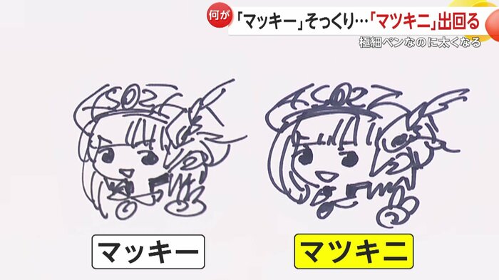 本物の「マッキー」で描いたイラストと比べると、「マツキニ」は極細のはずのペンで描かれた線にもかかわらず太くなりにじんでいるように見える。