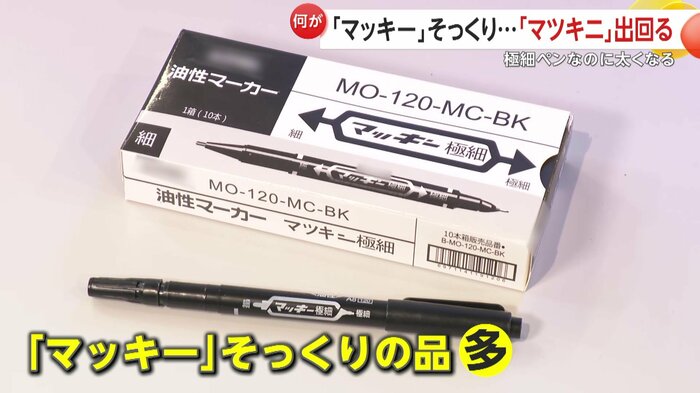 商品ロゴを、よく見てみると油性マーカーの「マッキー」ではなく書かれていたのは「マツキニ」。国民的文具マッキーそっくりの品が多く出回っているという。