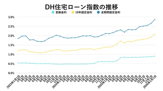 ※DHローン指数:ダイヤモンド不動産研究所とホームローンドクター株式会社が共同で作成している住宅ローン金利の参考指標。主要な銀行の住宅ローン商品をもとに、変動金利・固定金利・全期間固定型などの代表的な金利水準を算出したもので、市場の金利動向を把握するための目安として用いられています。