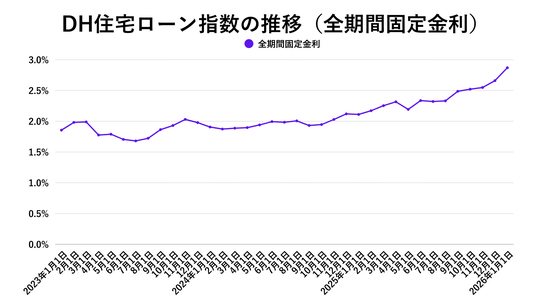2026年1月のDH住宅ローン指数における全期間固定金利は2.868%となり、前月の2.664%から上昇しました。前年同月の2.111%と比較しても上昇基調が続いており、全期間固定金利も依然として金利上昇局面にあるといえます。また、フラット35は約12年ぶりに2%台に達し、長期固定金利全体の水準が一段と切り上がったことを示しています。