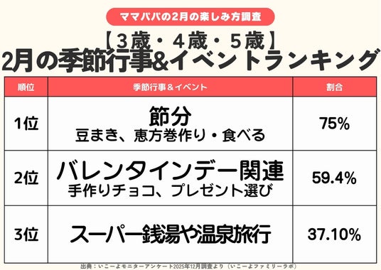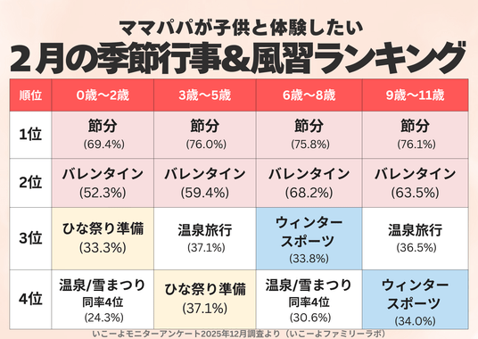 幼児家庭では、節分恵方巻・豆まきやバレンタインに加えて、「スーパー銭湯・温泉旅行」「雪まつり・雪景色」「ウィンタースポーツ」といった外出・体験型イベントも上位に。