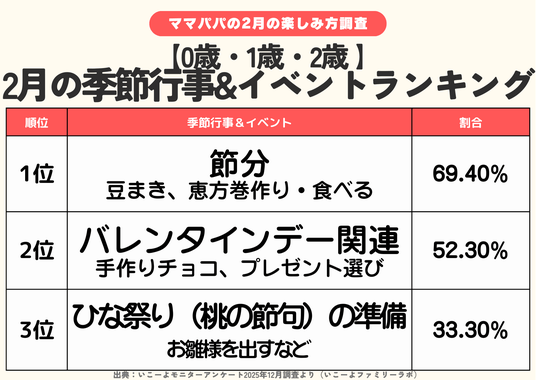 赤ちゃんのいる家庭では、「節分恵方巻・豆まき」「バレンタイン」に加え、「ひな祭りの準備」が上位に入りました。