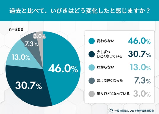睡眠中に生じる「いびき」は、日常的な現象として軽視されやすい一方で、加齢や生活習慣の変化とともに悪化するのではないかと不安を抱く人も少なくありません。一般社団法人 いびき無呼吸改善協会は、20~60代の男女300名を対象に、「いびきの体感変化」に関する調査を実施しました。その結果、強い自覚がない人が多い一方で、30~40代を中心に“少しずつ変化している”と感じる層が一定数存在することが明らかになりました。いびきの変化を感じ始めた時期や、その背景にある要因、医師・専門家への相談意識などを通して、いびきを取り巻く実態を読み解きます。