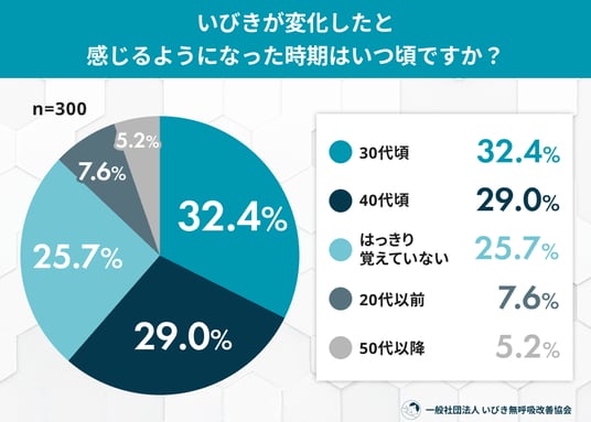 - いびきの変化を感じ始めた時期は「30代頃」32.4%、「40代頃」29.0%