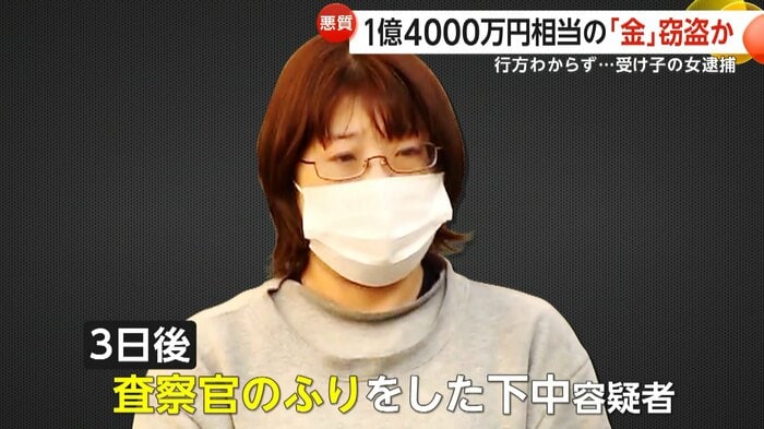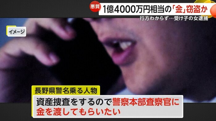 1億4000万円相当の金を騙し取った疑いで1月30日、女が逮捕された。女は警察官を名乗る共犯者と連携し、被害者から重さ9kgの金を直接受け取ったとされる。容疑を認める一方で、奪われた金の行方はわかっていない。