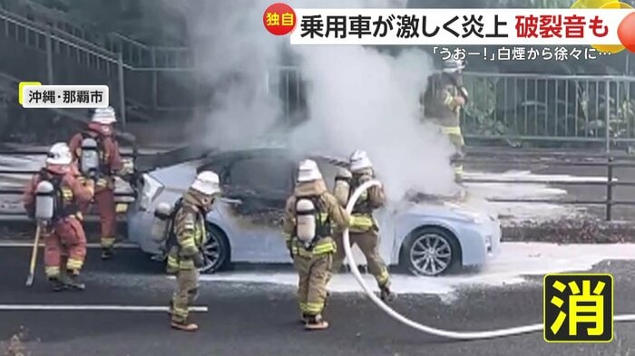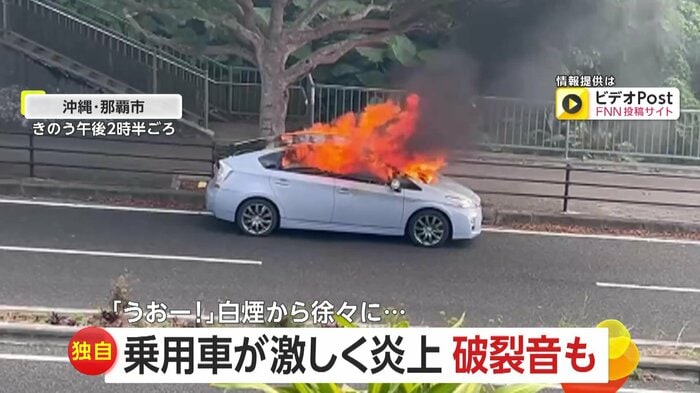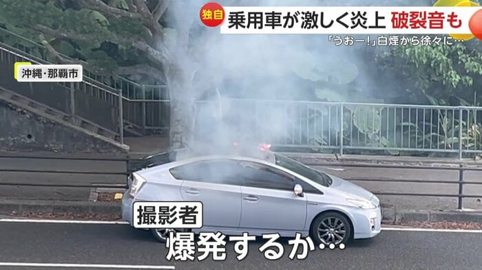 沖縄・那覇市で車から煙が上がり、炎上する一部始終がカメラに捉えられた。車両は赤い炎を上げて激しく燃え上がり、破裂音がして爆発するような瞬間も映っていた。