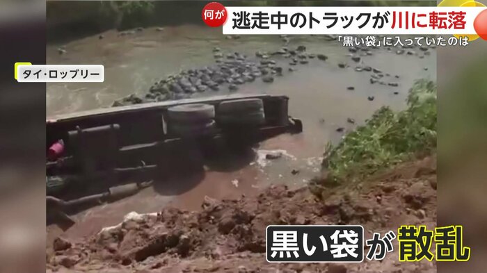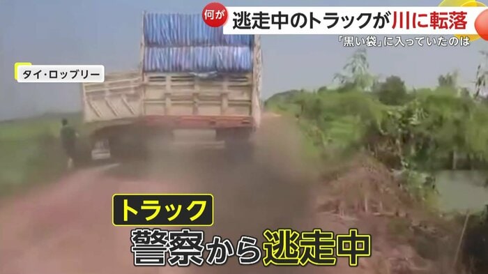 タイ・ロッブリーで麻薬を密輸するトラックが警察を振り切り、川へ転落する瞬間がカメラに捉えられた。荷台からは、黒い袋が次々と流出。袋の中身は大量の違法薬物だった。警察は人命を優先して川の中から運転手の救助を行い、その後逮捕した。