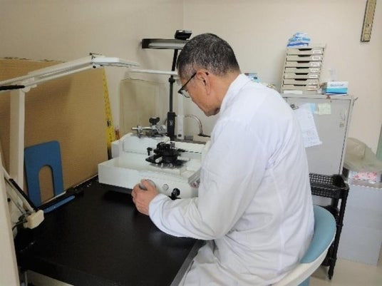 業務作業(パラフィン切片作製)をする渡邉技術専門職員