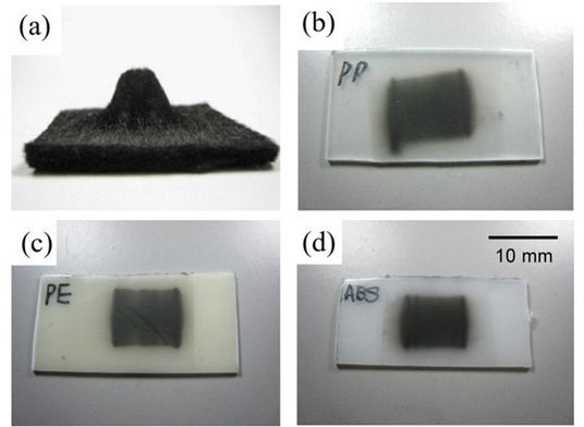 図. 炭素基板 (a) とポリプロピレン (b) 、ポリエチレン (c) 、アクリロニトリル・ブタジエン・スチレン (d) の基板上に短炭素繊維を用いた FAD 法による形成テスト結果。走査型電子顕微鏡(SEM)(注5)およびX線CT(注6)による詳細な観察から、構造体内部は比較的長い繊維が表面近くで垂直に配向したフレームを形成し、内部には短い繊維がランダムに高密度に充填された、独特な階層構造を持つことが明らかになりました。このプロセスでは繊維が粉砕されることなく、繊維同士の摩擦力によって強固に結合されるため、バインダーを一切使用せずに高い機械強度を実現しています。