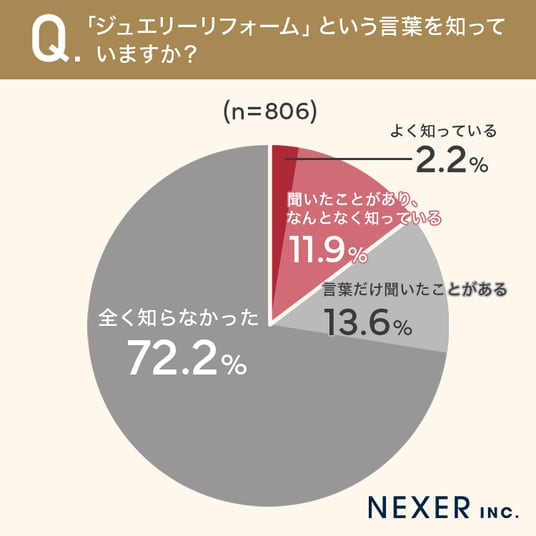 今回の調査では、ジュエリーリフォームという言葉を「全く知らなかった」と回答した方が72.2%にのぼり、認知度の低さが明らかになりました。