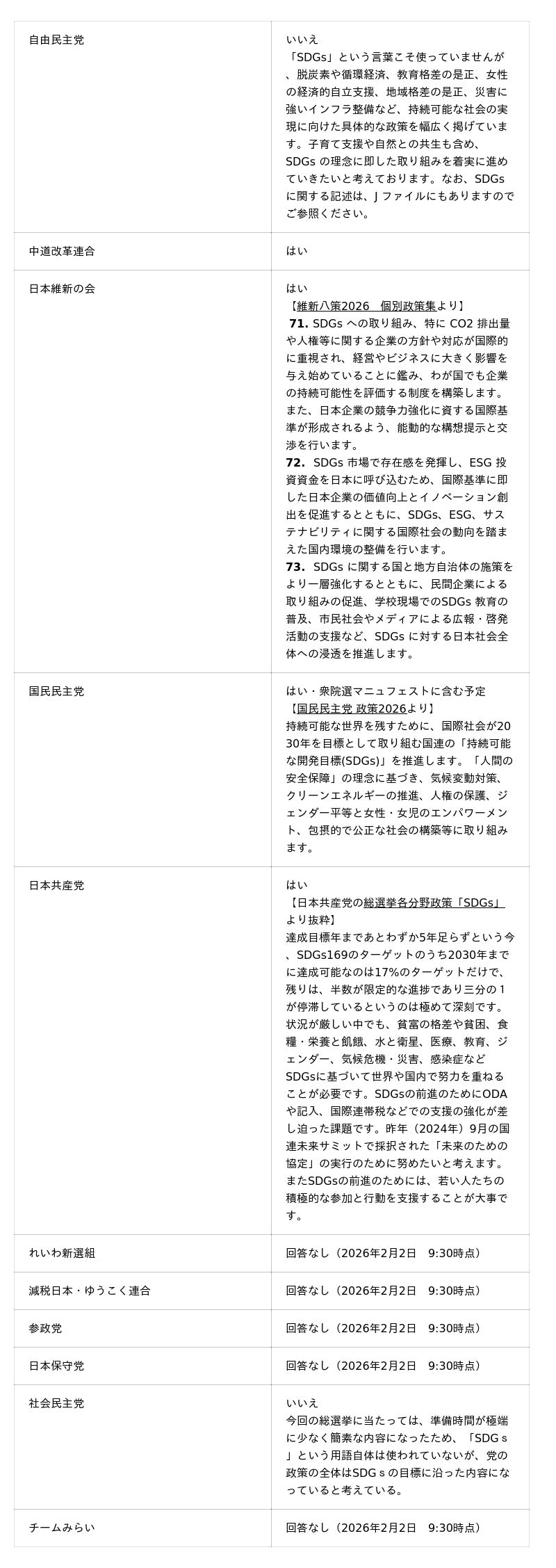 第51回衆議院議員選挙にあたり、(一社)SDGs市民社会ネットワーク(SDGsジャパン)は国会に議席を有し、今回の選挙で候補者を擁立した政党を対象に、「SDGsに関する政党アンケート」を実施しました。