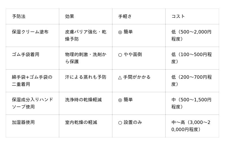 日本皮膚科学会の接触皮膚炎診療ガイドラインでも、刺激性接触皮膚炎の予防には原因物質との接触を避けることが基本とされています。しかし、生活上完全に接触を避けることは困難であるため、保湿剤による皮膚バリアの強化と、手袋などによる物理的防護が実践的な予防策となります。