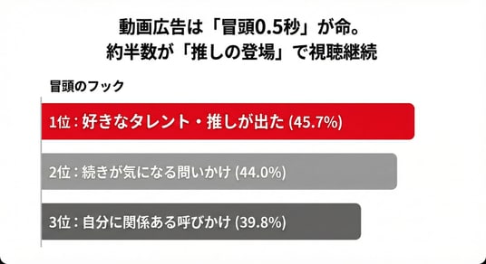 ■動画広告は「冒頭0.5秒」が命。45.7%が「推しの登場」で視聴を続行
