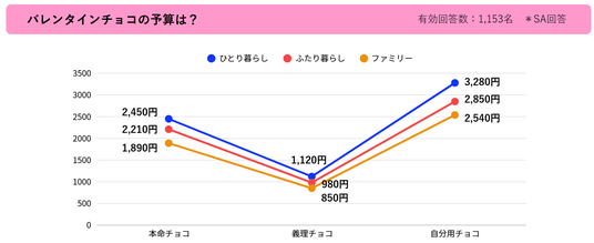全体の傾向として、「自分用」への投資が最も高く、次いで「本命」、最も低いのが「義理」となっています。特にひとり暮らし層では自分用チョコへの投資が最も高く、バレンタインが愛の告白という従来の行事から、自分へのご褒美チョコという個人の楽しみとしての側面を強めていることが分かります。