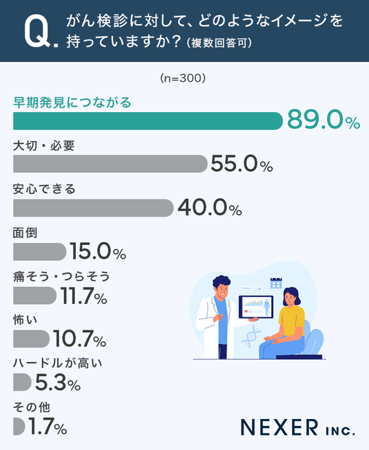 「早期発見につながる」と答えた人は89.0%と最も多く、「大切・必要」と感じている人が55.0%、「安心できる」と感じる人が40.0%でした。これらはポジティブなイメージを持つ人が多数を占め、がん検診の意義が多くの人に理解されていることがわかります。