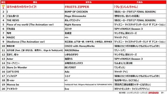 JOYSOUNDが秋アニメ主題歌カラオケランキングを発表! 『クレヨンしんちゃん』新主題歌、FRUITS ZIPPER 「はちゃめちゃわちゃライフ!」の人気沸騰!