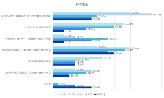 世代によって迷いの内容には明確な違いが見られました。20代、30代では「条件や人柄に不満はないが、自分の中で確信が持てない」が最も多く20代で50.0%、30代で64.3%でした。一方、40代、50代、60代では「結婚後の生活変化(仕事・住居・自由)に対する不安」が最も多く、それぞれ46.4%、35.7%、39.3%となりました。