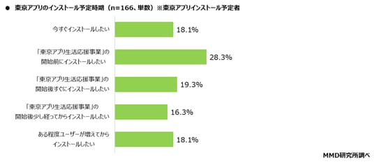 次に、東京アプリをインストールする予定と回答した166人を対象に、インストール予定時期を聞いたところ、「『東京アプリ生活応援事業』の開始前にインストールしたい」が28.3%と最も多く、次に「『東京アプリ生活応援事業』の開始後すぐにインストールしたい」が19.3%、「今すぐインストールしたい」と「ある程度ユーザーが増えてからインストールしたい」が18.1%となった。