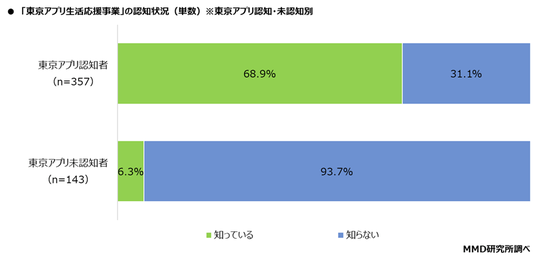 東京都に住民票がある500人を対象に、「東京アプリ生活応援事業」の認知状況を東京アプリ認知・未認知別で聞いたところ、「東京アプリ生活応援事業」を認知しているのは、東京アプリ認知者(n=357)が68.9%、東京アプリ未認知者(n=143)が6.3%となった。