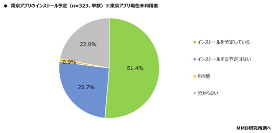東京アプリを現在利用していない323人を対象に、東京アプリのインストール予定について聞いたところ、「インストールを予定している」が51.4%、「インストールする予定はない」が25.7%となった。