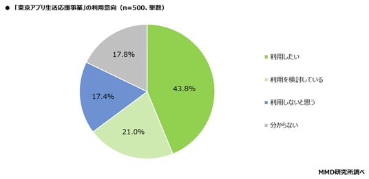 続いて、「東京アプリ生活応援事業」の説明をした後に利用意向を聞いたところ、「利用したい」が43.8%、「利用を検討している」が21.0%と、あわせて64.8%が利用したいと回答した。