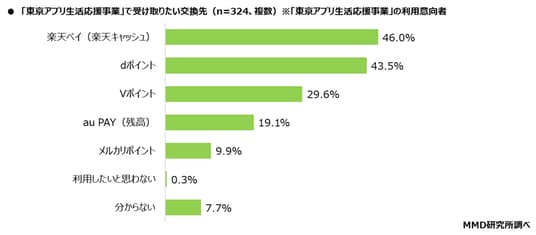 「東京アプリ生活応援事業」利用意向者324人を対象に、「東京アプリ生活応援事業」で受け取りたい交換先を聞いたところ(複数回答可)、「楽天ペイ(楽天キャッシュ)」が46.0%と最も多く、次に「dポイント」が43.5%、「Vポイント」が29.6%となった。