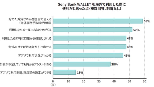 - Sony Bank WALLET の海外利用では、貯めた外貨が海外事務手数料無料で使える点やタッチ決済を便利だと回答いただいた。国内では現金でのキャッシュバックや提携ATMの手数料無料回数が最低4回になることを評価いただく結果に。