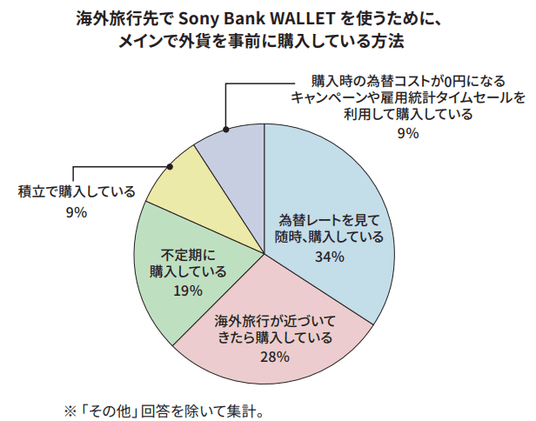 - 海外旅行のために普段より預金を多くしているかたは、前年より3ポイント増え24%。外貨を事前に購入しているかたのうち、海外旅行先で Sony Bank WALLET を使うために外貨を購入するタイミングは、「為替レートを見て随時購入」が最も多く34%。