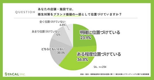 その結果、「明確に位置づけている」が23.9%、「ある程度位置づけている」が36.8%となり、両者を合わせた60.7%が、衛生対策をブランド価値の一部として認識していることがわかりました。