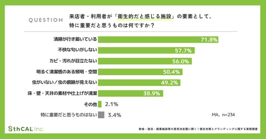 来訪者が衛生的だと感じる基準は、清掃(71.8%)だけではなかった! 匂い・カビ・照明・虫の不在も約半数が重視