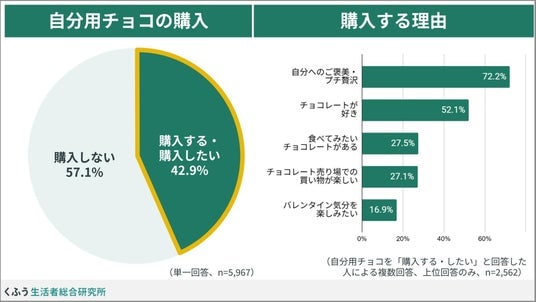 バレンタインのチョコレートを自分用に購入するという人は4割超(42.9%)。購入する理由は「自分へのご褒美・プチ贅沢」(72.2%)と回答した人が多い結果となりました。
