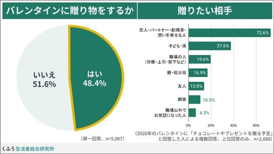 今年(2026年)のバレンタインデーに、約半数(48.4%)がチョコレートやプレゼントを贈る予定があると回答しました。