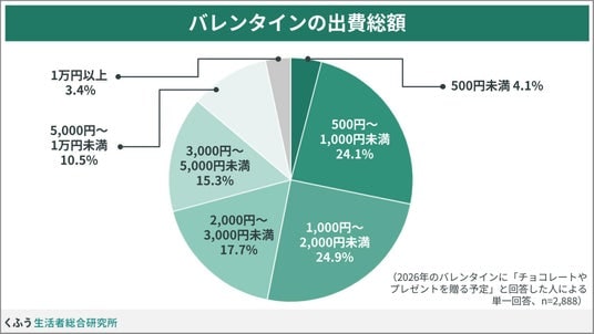 バレンタインの贈り物の予算(出費総額)は、「1,000円~2,000円未満」の価格帯が24.9%で最も多くなりました。