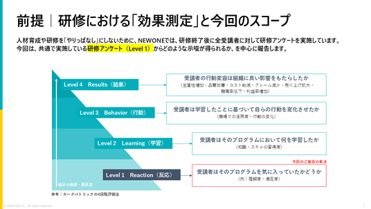 NEWONEでは、研修効果を評価する手法として評価フレームワーク「カークパトリックモデル」においてレベル1として定義されている、研修参加後の満足度や学び・気づき、職場での活用期待度といった受講者の「反応」を全研修プログラムにおいて測定しております。